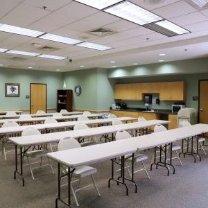 The versatile, climate-controlled, 800 square feet conference room has the flexibility of being arranged to accommodate meetings, banquets, seminars, or parties. It can comfortably hold 75 people with tables and chairs and has a service bar.