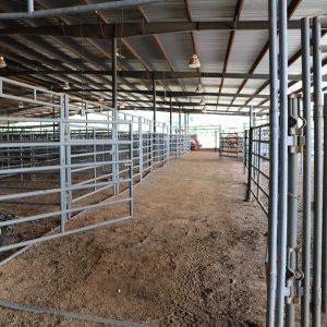 The pavilion is equipped to handle any type of livestock. The area is covered but not enclosed. The 38,000 square foot (250 x 150 feet) space has ninety 10 x 10 foot stalls, concrete wash racks with tie rails, electrical receptacles, lighting, and approximately 100 graveled parking spaces.