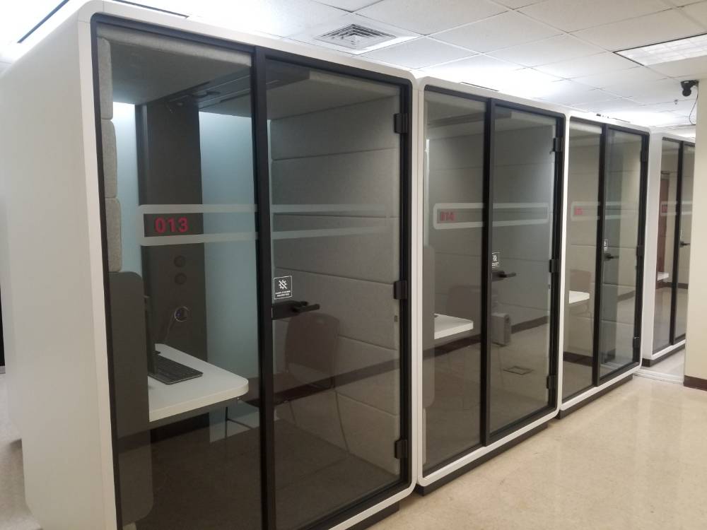 The soundproofing walls inside each pod help to significantly reduce noise levels. White noise aids in blocking outside distractions to construct a serene, yet productive workspace environment for our test takers.
